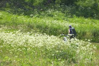 11:00 Передо мной предстоит дилемма. Цветика диван свободен - но он стоит в польном горячом солнце - с другой стороны есть тень но там вся трава высокая мокрая и там насекомые (и у меня все таки аллергия) . Заметил я пачка печения на Цветика диван - вот решение принято. Скоро уже подошли голодные реалбайкери. Я сказал Шведу и Лике что это все мое собственное печение и тайно наслаждаюсь как они меня умоляют им все-таки угостить.