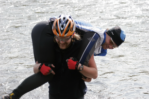 А к тому времени подрулили ребята, таки решившие поехать в брод. Ну брод и брод, фигли там, но, смотрю, чего-то все так оживились, фотики подоставали и давай щелкать. Оказалось, через брод несут Рейсера. Зрелище - зачОт!!! Что интересно, Швед с Рейсером не упал, хотя в приснопамятной Мещере, Аньку купал в обоих бродах, где ее носил. Где-то напрактиковался, что-ли? =)