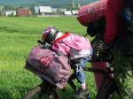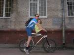 + в моей конструкции - ребенок спереди, хороший обзор и закрыт моим телом,при падении можно принять удар на себя, дождь не капает, едем и разговариваем, смотрю за ребенком, что делает, ребенок принимает участие в рулении, можно на рога еще книжку положить ребенок будет смотреть, я так карту крепил, дочь была "штурманом" =)