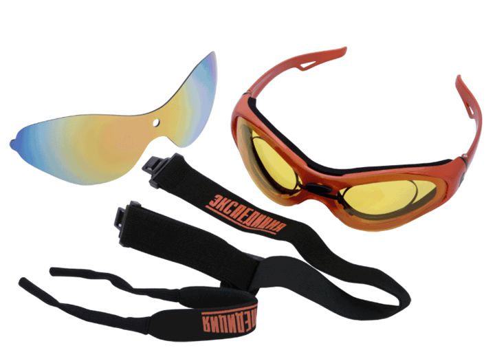 Недорогие очки-маска с двумя сменными светофильтрами на основе поликарбоната со 100% защитой от ультрафиолета (проверял в оптике). Один зеркальный солнцезащитный светофильтр, другой - жёлтый прозрачный для использования в сумерки и пасмурную погоду для повышения контрастности. В маску вставляется клепон для диоптрийных линз, показался не очень удобным, но ресницами до линз я не достал. По внутренней стороне оправы очков наклеен ободок из пористого материала для плотного прилегания к лицу. У меня низ оправы к лицу так и не прилёг, осталась небольшая щель, но это имхо особенности физиономии)) Сверху оправы пористая окантовка пот и несильный дождь держит, оставляя глаза сухими (в ливень в них пока не попадал). При остановках линзы изнутри запотевают (несмотря на шесть отверстий для вентиляции), при даже небольшой скорости быстро отпотевают. Юзаются либо с дужками как очки, либо с широкой резинкой как маска. Есть ещё одна резинка, поуже, для использования с дужками.