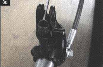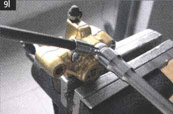 Поместите калипер в тиски и выкрутите фиксирующий болт (40) шланга (42) с помощью 8мм ключа.