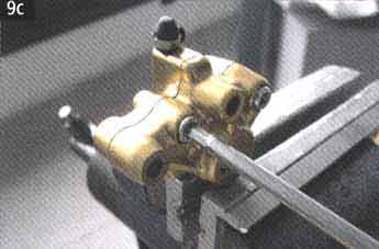 Установите обратно прокладки (47-57), предварительно смазав их и пистоны (48-52). Проверьте исправность и позиционирование прокладки (53) относительно обоих половинок калипера (35 - 56). Соберите калипер болтом (37) и слегка затяните его.